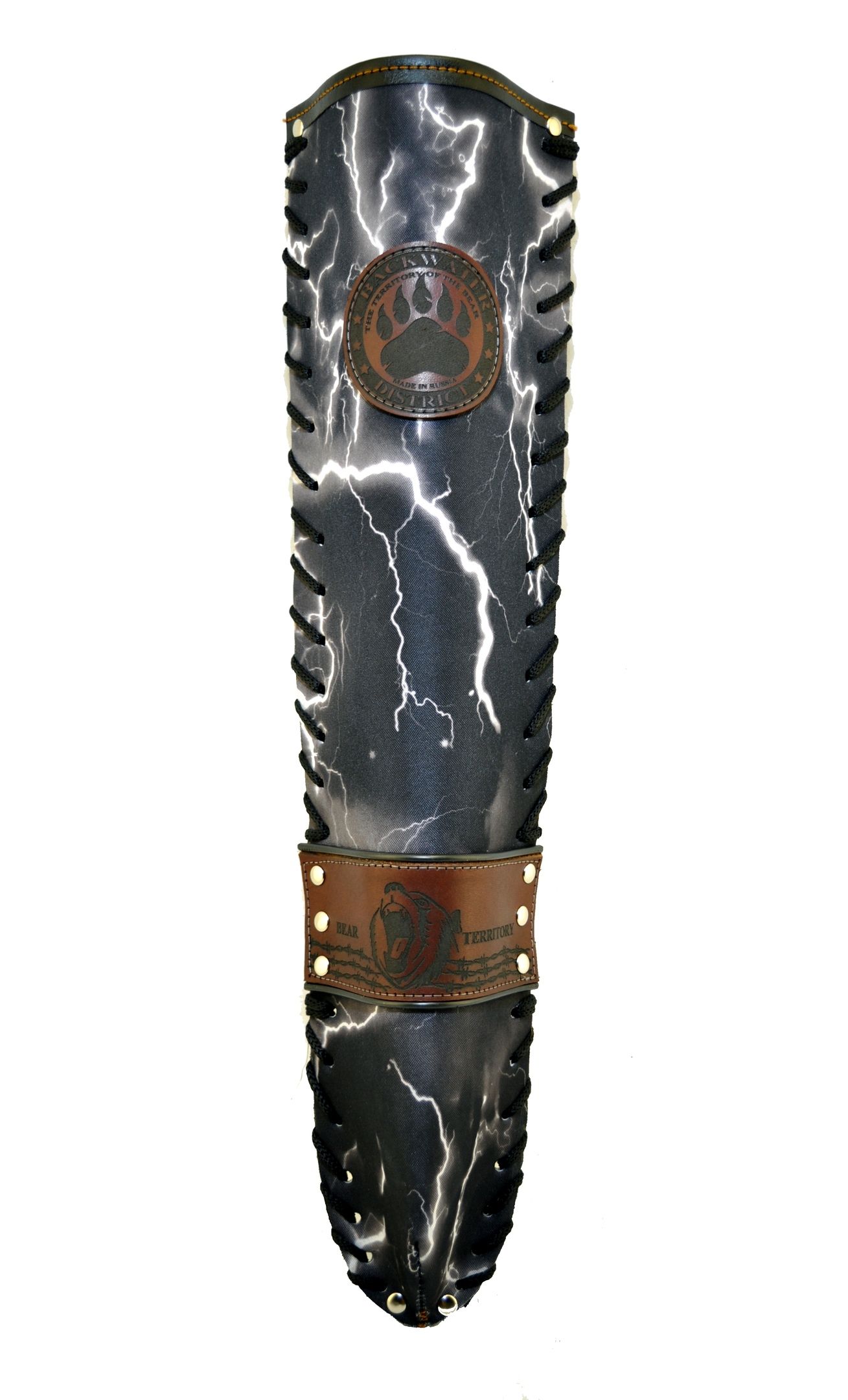Заплечный комбинированный колчан выполнен из материала кордура на основе ПВХ с вставками из толстой кожи и пирографией что делает его не промокаемым. Жесткая основа.  В углах фиксирован заклёпками.Прочный шнур на жёсткой фиксации. Широкий ремень из натуральной кожи. Ограниченная серия.